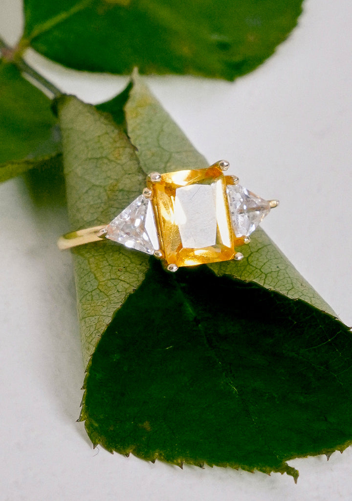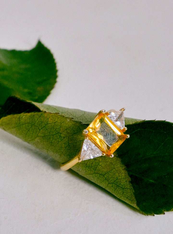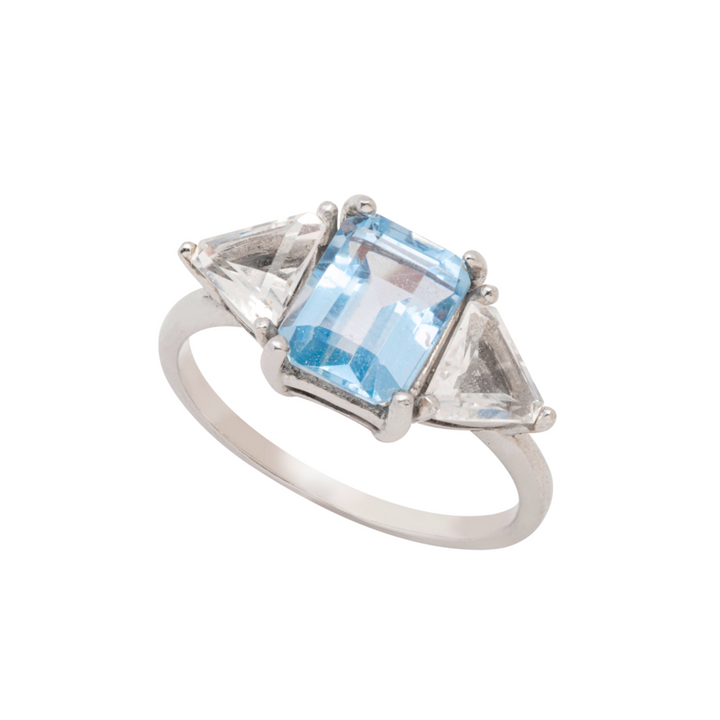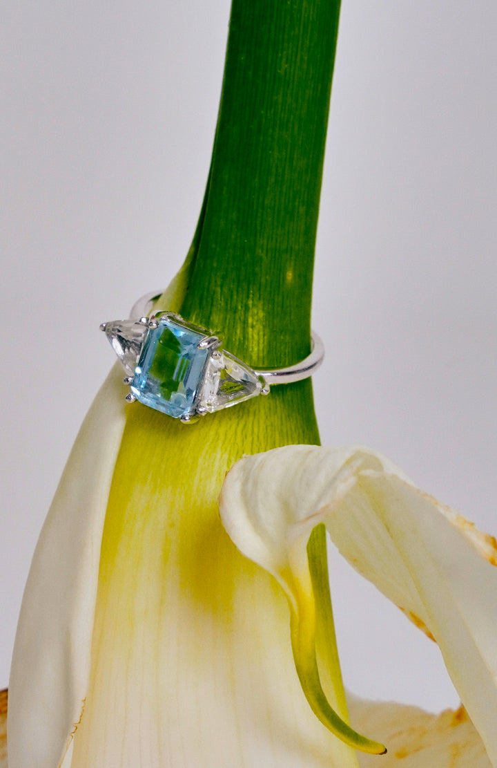 Design: O anel apresenta um aro, com pedras preciosas centrais em formatos geométricos distintos, como retângulo da gema a sua escolha no centro, e triangular em topázio branco nas laterais, combinadas para criar um visual moderno e imponente.